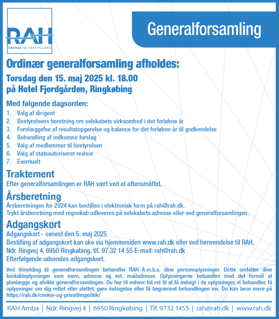 RAH a.m.b.a. afholder generalforsamling torsdag d. 15. maj 2025 kl. 18.00 på Hotel Fjordgården.